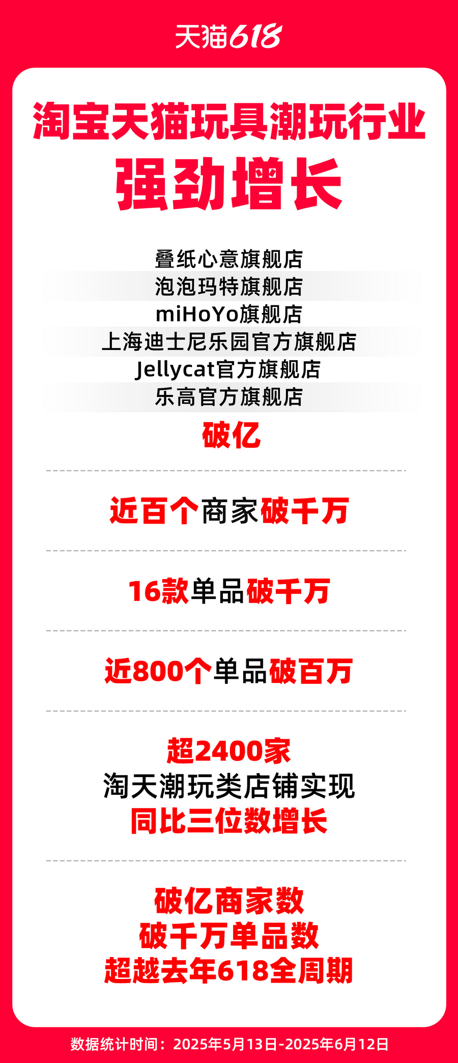 中外玩具网数据显示,2025年618期间,淘天玩具潮玩行业共产生破亿商家6个,千万商家超100个,千万单品超20个,百万单品超1000个,远超去年618战绩。