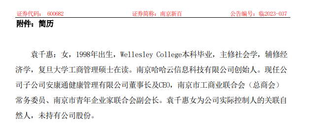 值得一提的是,据天眼查,12月12日,袁千惠卸任哈哈云法定代表人等负责人职务。除上任南京新百副总裁之外,信息显示,袁千惠目前还在9家公司担任高管,这些公司主要集中在养老产业方向,其中有两家公司已注销。