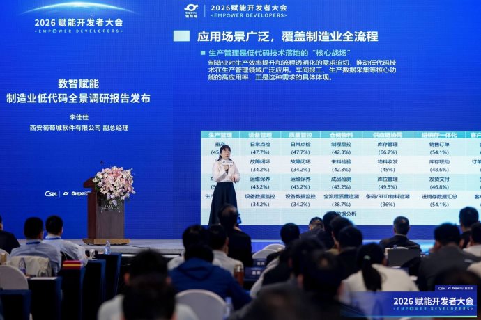 大会现场,西安葡萄城软件有限公司副总经理 李佳佳发布《数智赋能:制造业低代码全景调研报告》,从更系统的视角给出了行业观察。报告指出,低代码正加快向生产管理、设备管理、质量管控、供应链协同、客户与订单管理、数据可视化等关键环节延伸。围绕这些场景需求,葡萄城进一步展示了覆盖应用开发、数据分析与可视化、数据建模、数据连接及多终端交互的制造业全栈技术方案,并提出 AI 辅助开发与 AI 数据分析预警正成为企业未来重点关注的两类 AI 落地方向。