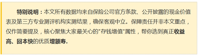 增额寿的核心价值在于长期复利增值,IRR(内部收益率)是衡量增额寿收益水平最客观的指标,越接近监管上限,产品的收益竞争力越强。想要选到收益高的增额寿,一定要重点关注IRR指标,而不是只看表面的保额增长比例。